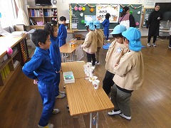 12月11日(木)、1年生は、盛こども園年長児さんを招待して、「あきのおもちゃまつり」をしました。年長児さんに楽しく遊んでもらえるように、5つのグループに分かれて、手作りのおもちゃを作るなど、「おもちゃまつり」の準備をがんばってきた1年生です。はじめは、緊張していた年長児さんもだんだん慣れてきて、1年生のつくったおもちゃで楽しそうに遊んでいました。お兄さん・お姉さんとしての姿が見られた1年生、来年4月に小学生になる年長児さん、来年度に向けて、それぞれがとてもいい雰囲気で交流していたと感じました。盛こども園の先生方には、お忙しい中ご協力いただきありがとうございました。