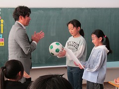 サッカーボールを寄贈していただきました 明治安田生命の出前授業後に、サッカーボールを寄贈していただきました。4年生の代表2名が受け取りました。明治安田生命様には、これまでも様々ご支援をいただいております。ありがとうございました。