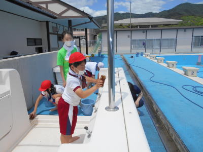 この日に体育館でプール納めが行われました。今年の夏は猛暑続きで,2学期に入ってからも,時間を制限しながらプール学習を行いました。子どもたちは,このような限られた時間の中で目標に向かって学習に取り組みました。式では,学年代表の子どもたちが,頑張ったことや,来年の目標を全校の前で発表しました。最後は,保健体育委員会の代表児童の合図で,全校でプールに感謝の挨拶をして終えました。この夏に身に付けた泳力を,来年さらに高められるといいですね。