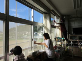 | この日行われた避難訓練は,不審者から身を守る訓練です。大船渡警察署生活安全課の方をお招きし,ご指導を受けました。職員室内で,職員が不審者役と対峙している中,子どもたちは音も立てず,声も出さずに避難場所に移動することができました。集合後も,整然を次の指示を待つことができました。