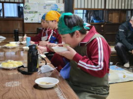 5年生は,つむぎの家で収穫祭を行いました。5月の田植え,7月の草取り,10月の稲刈りを経て育てた餅米を,自分たちでついてお餅にしました。今年も,たくさんの地域の方々にサポートしていただきながら行った餅つきでした。ふかふかのお餅は,きなこ,みたらし,大根おろし,エゴマの4種類の味付けでいただきました。みんなで作ったお餅は格別においしかったです。また,デザートのりんごもいただき,お腹がいっぱい味わうことができた収穫祭でした。