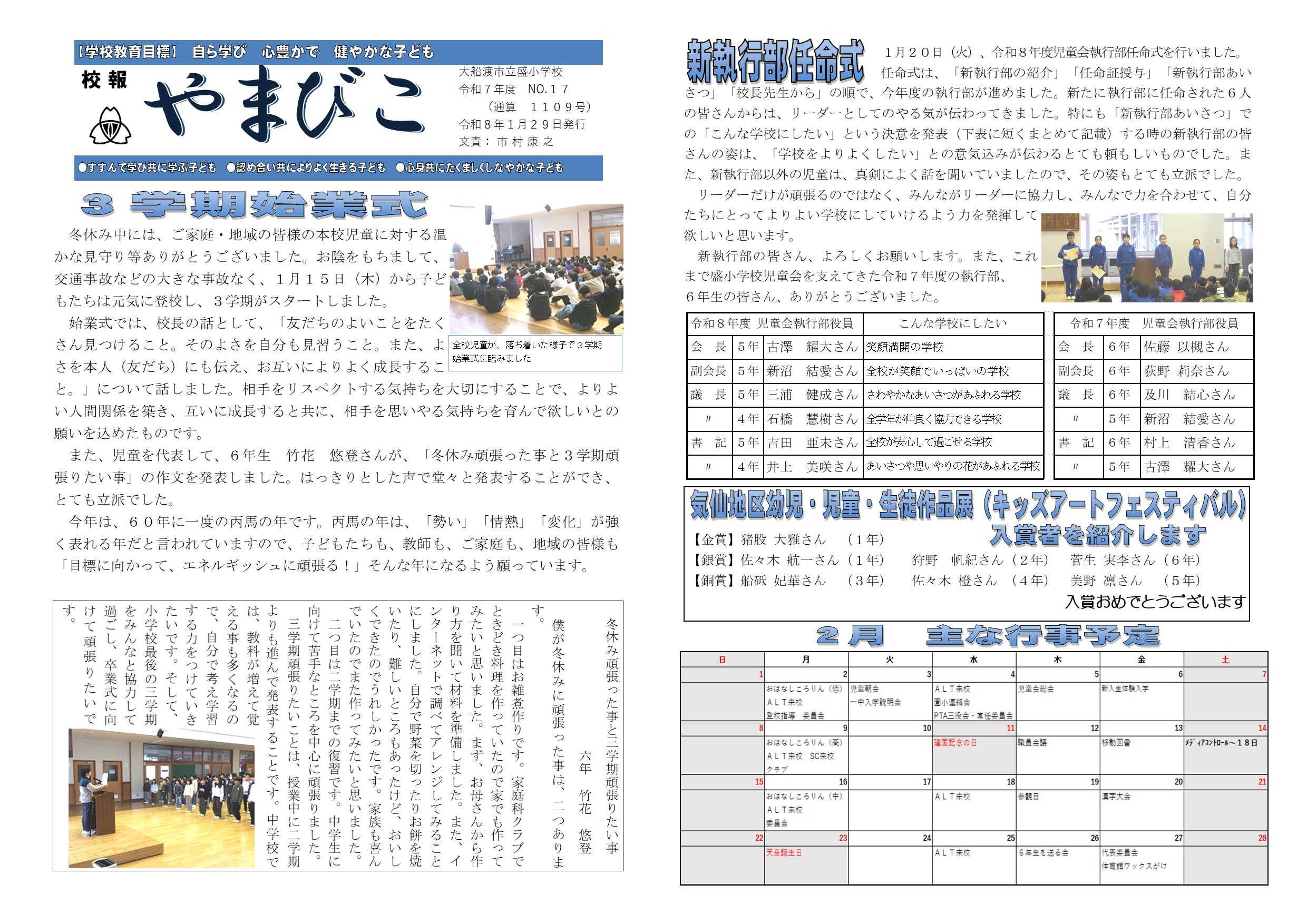 2月10日(火)児童会朝会にて、児童会執行部・委員会委員長の引継をしました。はじめに、現執行部役員から新執行部役員にファイルを手渡しました。続いて現委員会委員長から新委員会委員長にファイルを手渡しました。その後、新委員長が一人一人決意を発表しました。それぞれの委員会活動の趣旨を考え、委員長として何ができるのか、何をがんばりたいのかを考えて発表することができ立派でした。