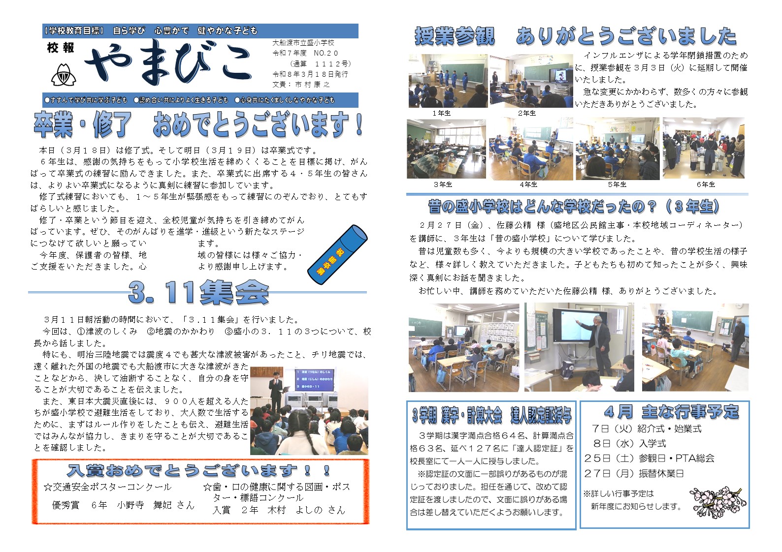 この一年、盛小学校が子どもたちの笑顔でいっぱいになるよう、子ども一人ひとりの健やかな成長を育むよう、教職員一同、力を合わせて取り組んでまいります。
