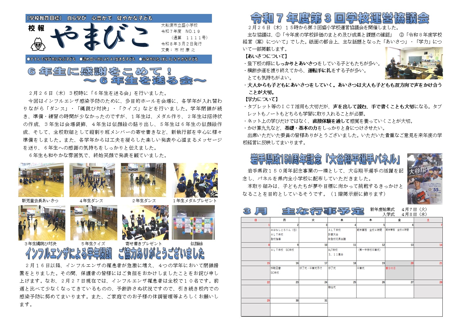令和7年度第19号(通算 no.1111) ★6年生に感謝をこめて~6年生を送る会~ ★インフルエンザによる学年閉鎖 ご協力ありがとうございました ★令和7年度第3回学校運営協議会 ★岩手県政150周年記念「大谷翔平選手パネル」 ★3月主な行事予定