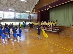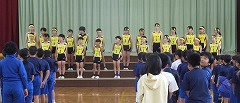 市内小学校陸上競技記録会壮行式 9月24日(水)朝活動の時間に、市内小学校陸上競技記録会の壮行式を行いました。選手の紹介、選手代表のあいさつ、応援(エール)という次第でした。記録会での選手の活躍と選手を支える応援団の声援を期待しています。