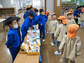 1年「あきのおもちゃまつり」 1年生が盛こども園の子どもたちを招待して、「あきのおもちゃまつり」を開催しました。これまで生活科の授業の中で、自分たちで手作りのおもちゃを制作してきました。 教室に並んだのは、まといれコーナー、めいろコーナー、けんだまコーナー、がっきコーナーです。お世話をする1年生もとても楽しそうです。