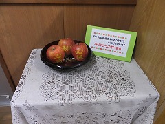 4年生の村谷晴也さんのご家族の方から、「盛小学校」「必勝」の文字が入ったりんごをいただきました。職員玄関に飾っています。ありがとうございました。